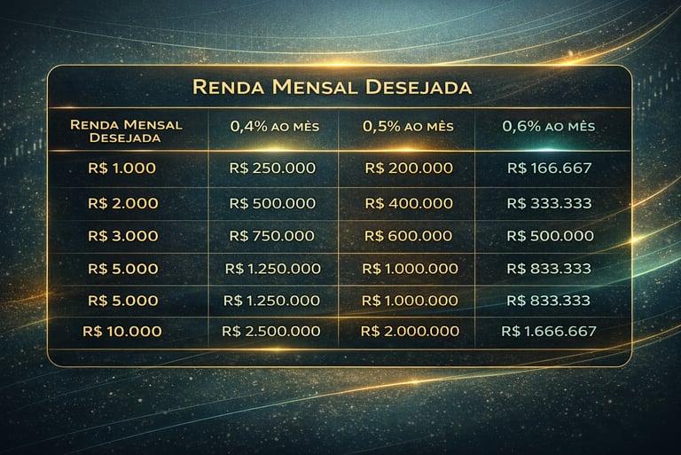 Em uma faixa de 0,4% a 0,6% ao mês, o patrimônio necessário costuma ficar entre aproximadamente R$ 500 mil e R$ 750 mil. Um valor de referência bastante usado é R$ 600 mil, assumindo rendimento em torno de 0,5% ao mês.