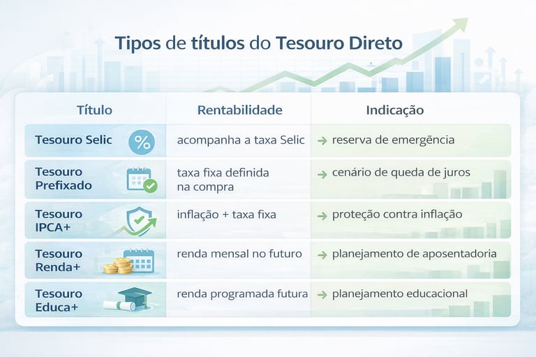 Conheça todos os títulos do Tesouro Direto, como Tesouro Selic, Prefixado, IPCA+, Renda+ e Educa+. Veja como cada um funciona, quais são as diferenças e como escolher o melhor investimento para seus objetivos financeiros.